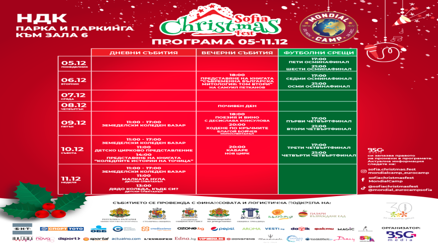 шоколад, ароматна храна и време с любимите хора. Коледното градче на Sofia Christmas Fest и фен зоната на Monidal Camp, намиращи се в парка зад НДК, ви очакват с много празнични предложения и изненади. Там ще намерите освен красив коледен базар с къщички, където може да опитате различни видове кухни и множество напитки, но и пъстра програма за цялото семейство като част от нея се провежда в специално изградена, топла шатра с удобна мека мебел.